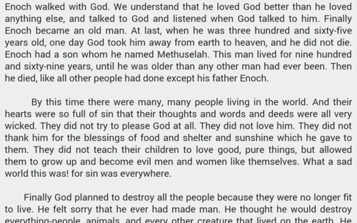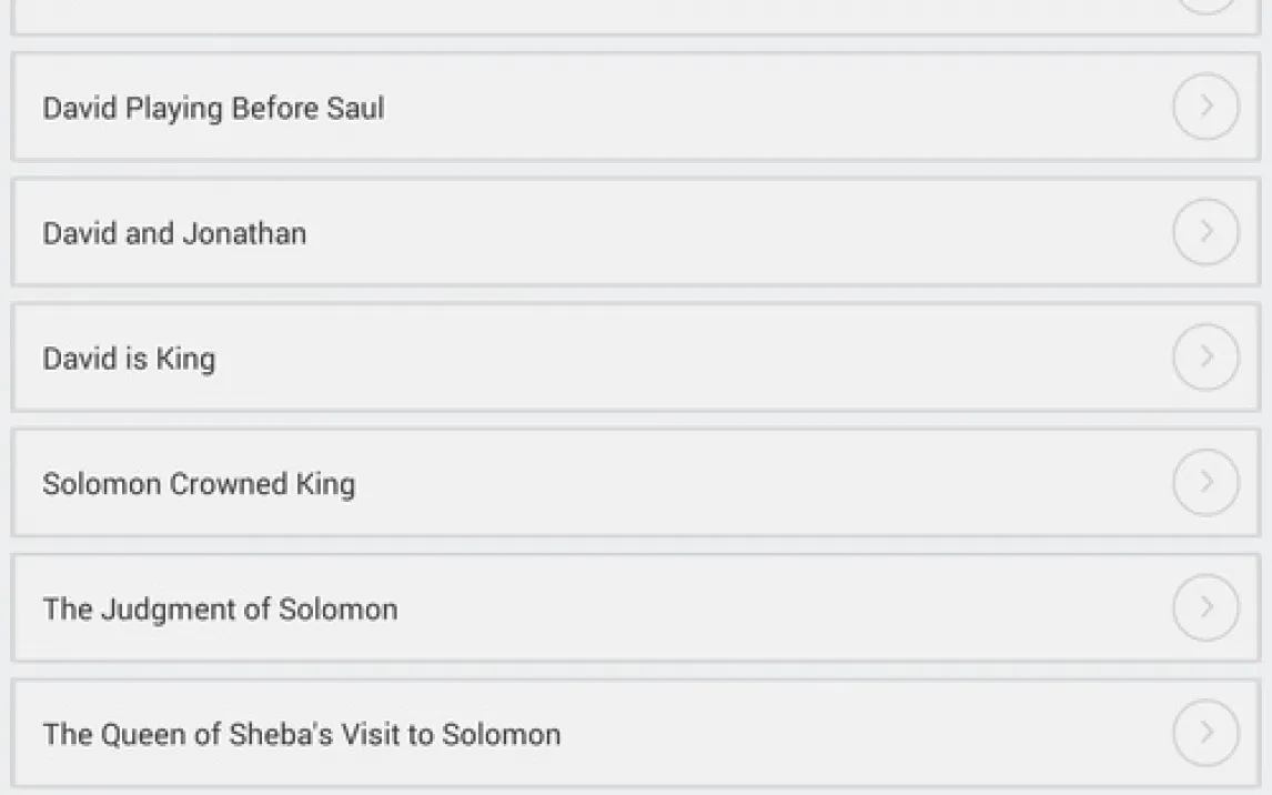 Приложение включает более 100 отдельных повествований из Ветхого и Нового Заветов. Все материалы систематизированы в четыре тематических раздела: два посвящены Ветхому Завету, два — Новому. Навигация реализована через список с названиями историй, что позволяет быстро находить конкретные сюжеты, такие как история Каина и Авеля, Ноев ковчег, Вавилонская башня, Давид и Голиаф или суд Соломона. Контент доступен для прослушивания в офлайн-режиме после загрузки.