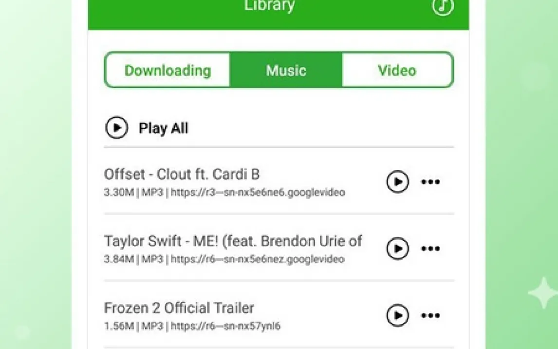 Работать с загрузчиком невероятно просто: введите в поиск название песни, имя исполнителя, альбома или прямую ссылку на видео. Система мгновенно найдёт нужный материал среди множества источников. После этого вы сможете предварительно просмотреть ролик, чтобы убедиться в его качестве и содержании, а затем одним тапом начать загрузку. Приложение предлагает гибкие настройки: вы можете скачать видео целиком в форматах HD или сохранить только звуковую дорожку в MP3, экономя место на устройстве. Для каждого файла отображается точный预估размер, что позволяет контролировать свободное пространство в памяти.