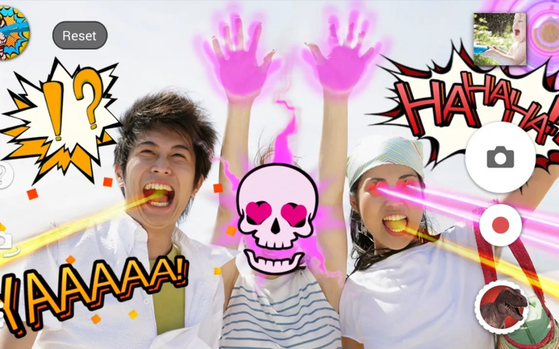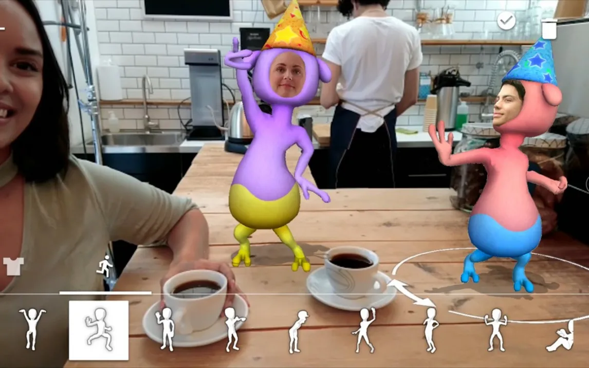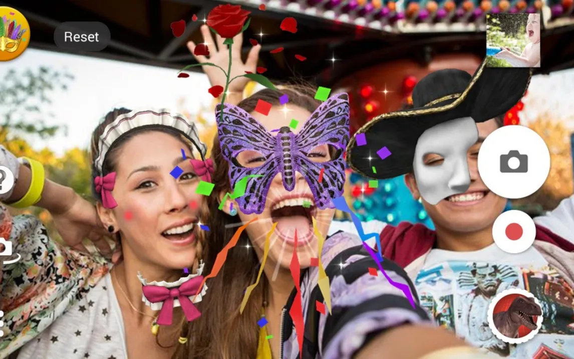Основной режим работы приложения — это съемка фото и видео с эффектами дополненной реальности в реальном времени. После захвата кадра пользователь получает доступ к библиотеке фильтров, которые можно активировать одним касанием. Каждый эффект, будь то динозавр или волшебное существо, является интерактивным элементом: его можно перемещать по экрану, изменять в размере и вращать для точного вписывания в композицию. Технология отслеживания лиц сохраняет привязку объекта к выбранной точке даже при движении, что критично для создания плавных видео.