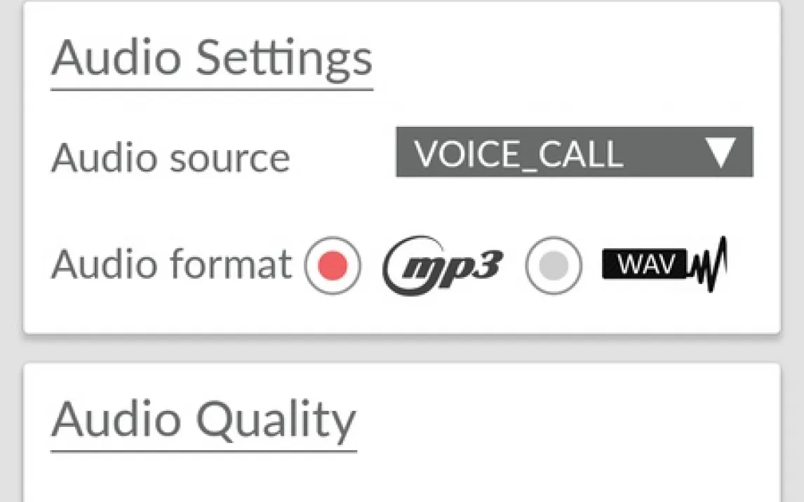Приложение предоставляет пользователю полный контроль над параметрами аудиозаписи. В настройках доступен выбор качества звука, что напрямую влияет на размер конечного файла и чёткость голосов. Важным техническим моментом является возможность выбора источника звука: это может быть микрофон устройства, голосовой вызов (системный звук) или их комбинация, что критически важно для совместимости с различными моделями смартфонов и операторами связи. Все записи организуются в выбранную вами папку хранения, а экспорт доступен в двух распространённых форматах — сжатом MP4 для экономии места или несжатом WAV для максимального качества.