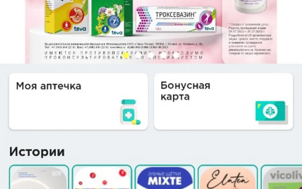 Главный экран становится вашей отправной точкой. Здесь собраны текущие акции, новинки и бестселлеры, а также прямые трансляции из социальных сетей сети — вы всегда в курсе выгодных предложений и новостей. Каталог логично разделен на категории, что позволяет быстро найти не только лекарства, но и средства гигиены, витамины, медицинские приборы или товары для детей.