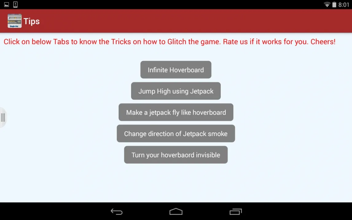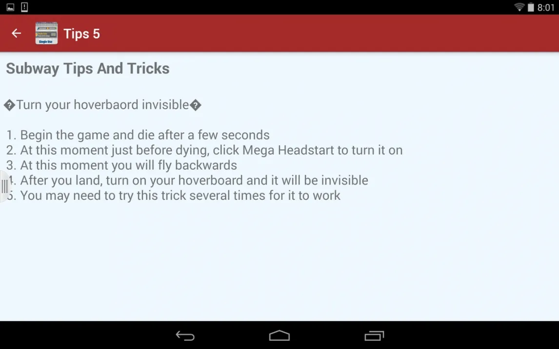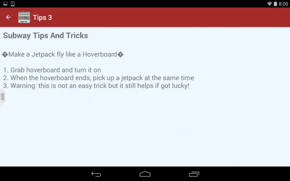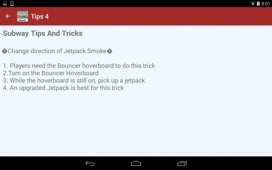 Приложение Guide For Subway Surf позиционируется как специализированный справочник по внутренней механике и скрытым аспектам геймплея популярного раннера Subway Surfers. Это инструмент, который структурно представляет собой каталог текстовых инструкций, организованных через системное меню. Функционал сводится к навигации по разделам, каждый из которых содержит описание конкретных игровых действий или трюков. Интерфейс выполнен минималистично, без графических или видео-пояснений, что делает акцент исключительно на текстовом содержании.