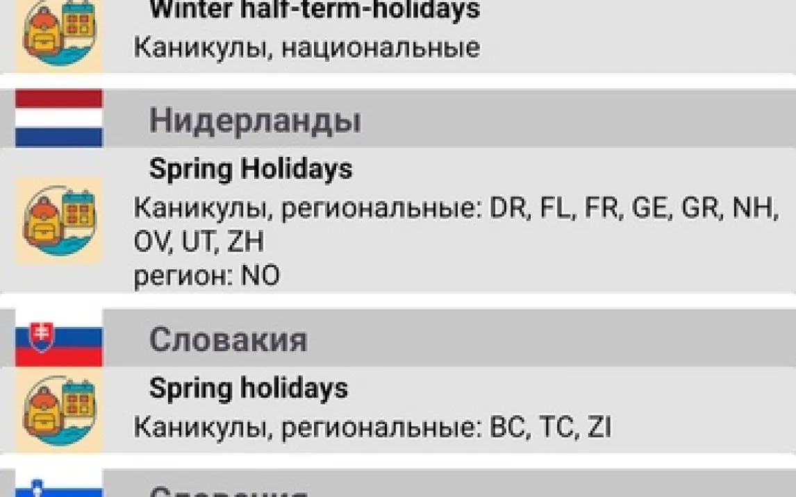 Сервис предоставляет доступ к структурированной базе данных официальных нерабочих дней и периодов отдыха для 36 государств, с акцентом на европейский регион. Механизм работы построен на анализе законодательных актов и учебных графиков. Пользователь может изучать данные ретроспективно, начиная с 2020 года, а также получать актуальную информацию на текущий и плановые периоды (4–5 лет вперед). Функционал включает детализацию: выборка по конкретным странам через настройки и просмотр деталей по региональным или локальным событиям. Для работы с обширными данными реализован режим Turbo, который ускоряет обработку запросов и исключает показ рекламных материалов.