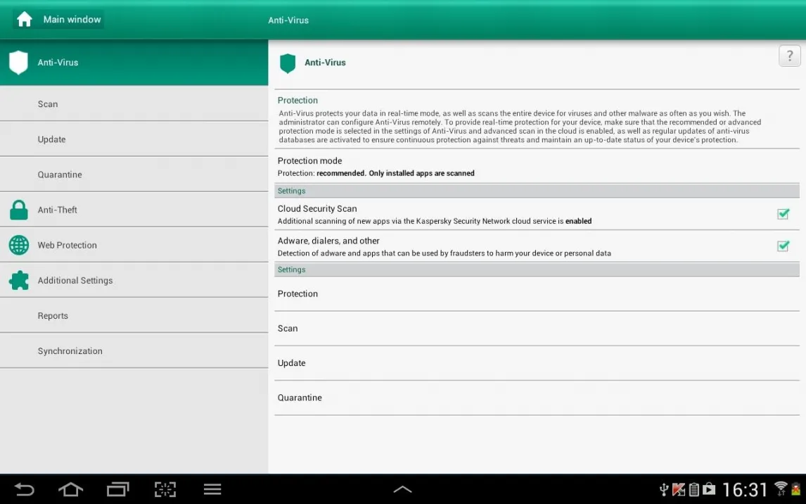 Приложение функционирует как клиентская часть на устройстве, полностью управляемая через консоль администратора. Его архитектура построена вокруг нескольких ключевых модулей. Антивирусный движок выполняет непрерывный мониторинг системы в реальном времени, используя как локальные сигнатуры, так и облачную аналитику Kaspersky Security Network для выявления новых и неизвестных угроз. Сканирование происходит как по расписанию, так и в фоновом режиме, охватывая установленные приложения, файловую систему и оперативную память на предмет наличия троянов, шпионского и рекламного ПО.