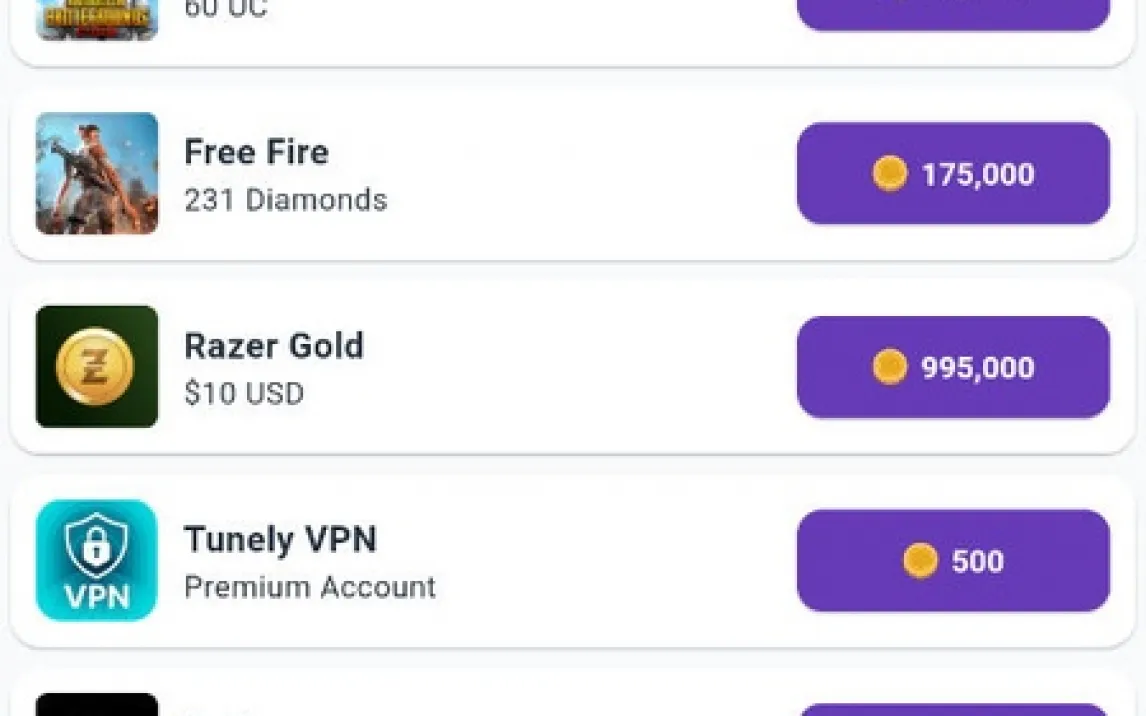 Накопленные монеты конвертируются в реальные призы в разделе магазина. Ассортимент регулярно обновляется и включает в себя подарочные карты и кредиты для популярных платформ. Вы можете выбрать относительно небольшой, но моментальный приз вроде случайного ключа Steam или сфокусироваться на крупных целях: пополнении счета PayPal, получении кредита для PS Store или Xbox, покупке Robux и алмазов для Free Fire. Также доступны полезные подписки, например, премиум-аккаунт Tunely VPN. Для азартных пользователей работает таблица лидеров, где можно сравнить свои успехи с другими.