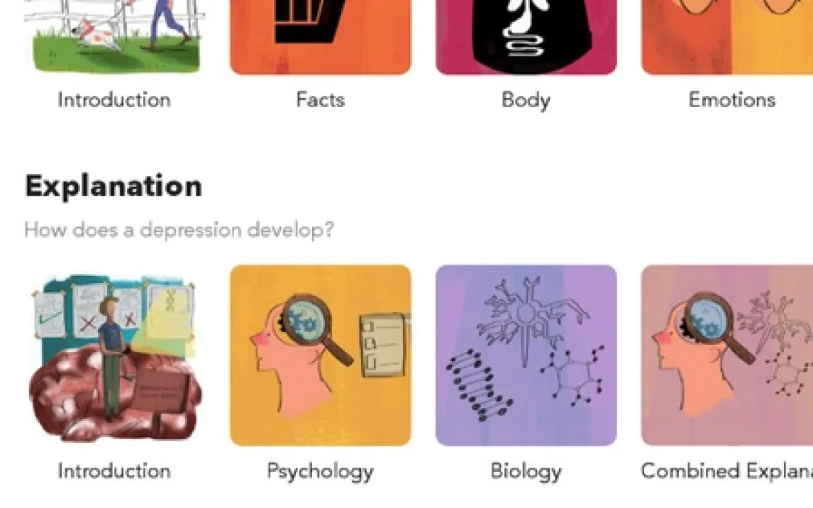Ежедневное взаимодействие с приложением заключается в ответах на серию вопросов, касающихся различных аспектов жизни: качества сна, уровня энергии, сложности принятия решений, проявлений тревожности или подавленного настроения. Система анализирует вводимые данные и визуализирует тенденции в личном кабинете. Отдельный модуль «База знаний» содержит обширную библиотеку статей и материалов, посвящённых теме ментального здоровья, включая научно-популярные статьи о механизмах стресса, тревоги и депрессии.