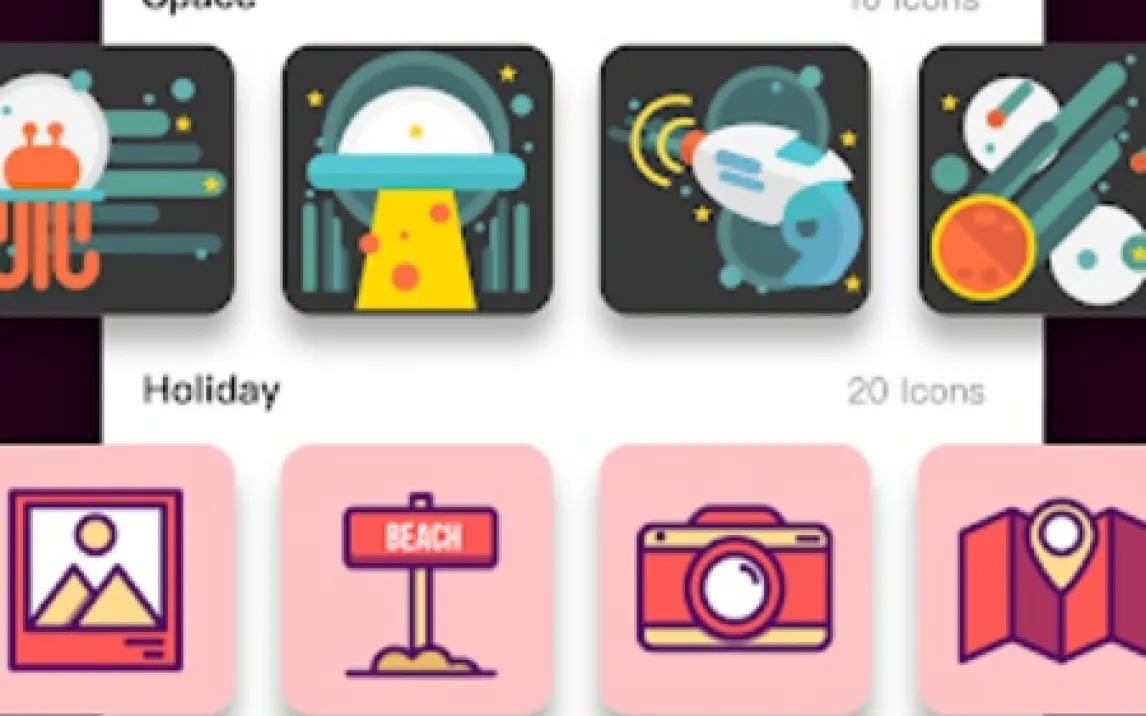 MyICON функционирует как комплексный инструмент для кастомизации. Его ядро — это обширная библиотека иконок, включающая как минималистичные монохромные наборы, так и детализированные тематические пакеты. Пользователь может применять темы целиком или выборочно заменять значки для отдельных приложений. Механика работы интуитивна: после выбора набора иконок приложение предлагает использовать встроенный лаунчер или пошаговую инструкцию по ручной замене через настройки системы для полной интеграции. Дополнительный модуль позволяет создавать собственные значки, используя базовые формы, градиенты и импортированные изображения, что обеспечивает практически безграничные возможности для дизайна.