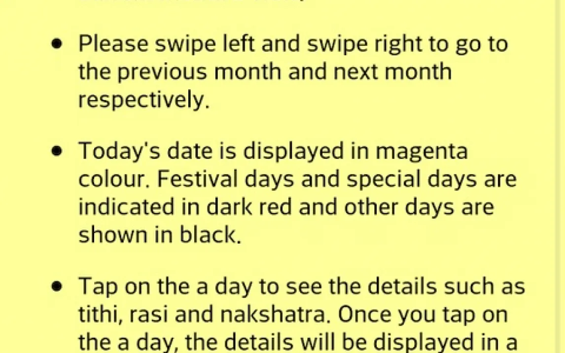 Приложение предлагает детальный календарь с традиционным летоисчислением, где каждый день сопровождается актуальной информацией. Вы видите не только текущую дату, но и данные о титхи, накшатре, йоге и каране. Отдельный раздел посвящён праздникам и памятным дням, их описаниям и значению. Для планирования важных событий доступен расчёт благоприятного времени (мухурта). Интерфейс интуитивно понятен: вы легко переключаетесь между месяцами, находите нужные события и настраиваете уведомления, чтобы ничего не пропустить.