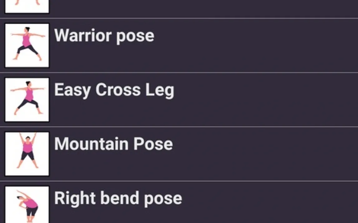 Основной интерфейс приложения сведён к минималистичному управлению: после запуска пользователь видит центральную кнопку для начала занятия и ряд опций для настройки. Все упражнения демонстрируются с помощью анимированного схематичного персонажа, что позволяет визуально отслеживать корректность позы. Над анимацией расположена информационная панель, отображающая хронометраж выполнения текущей асаны и общую продолжительность сеанса. Управление таймером осуществляется через кнопку в нижней части экрана, которая запускает и приостанавливает отсчёт времени для каждой позы.