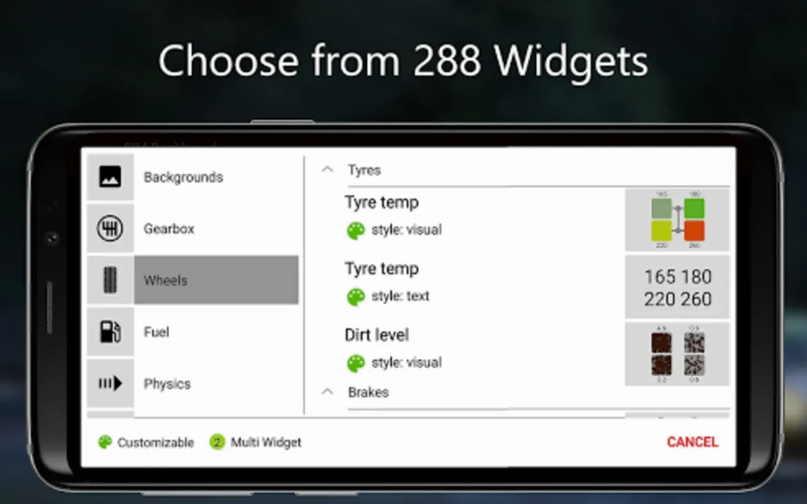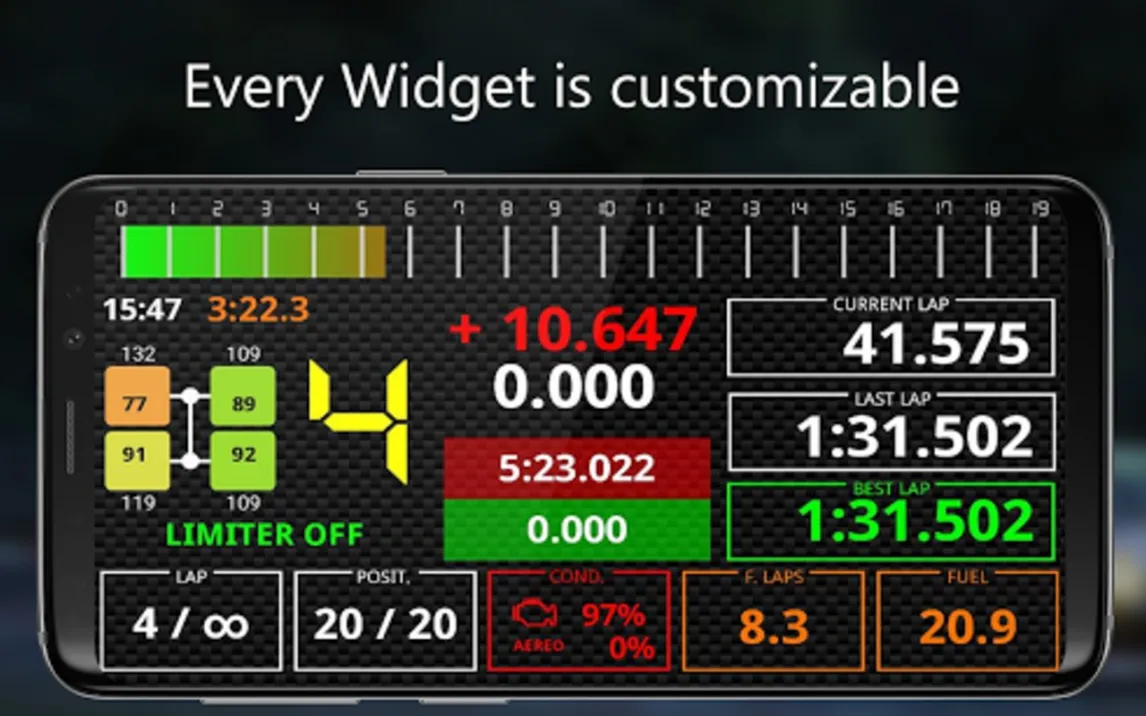 Приложение функционирует как высоконастраиваемый удаленный дисплей, подключаемый к игровой системе через Wi-Fi или USB-соединение. Его основная задача — дублирование и визуализация игровых данных в реальном времени на отдельном Android-устройстве. Это позволяет разгрузить основной экран от второстепенной информации и сфокусироваться на управлении. Ядро системы составляет библиотека, содержащая более 200 специализированных виджетов, каждый из которых отвечает за отображение конкретного параметра: от текущей скорости и оборотов двигателя до износа шин, температуры тормозов, расхода топлива и времени круга.