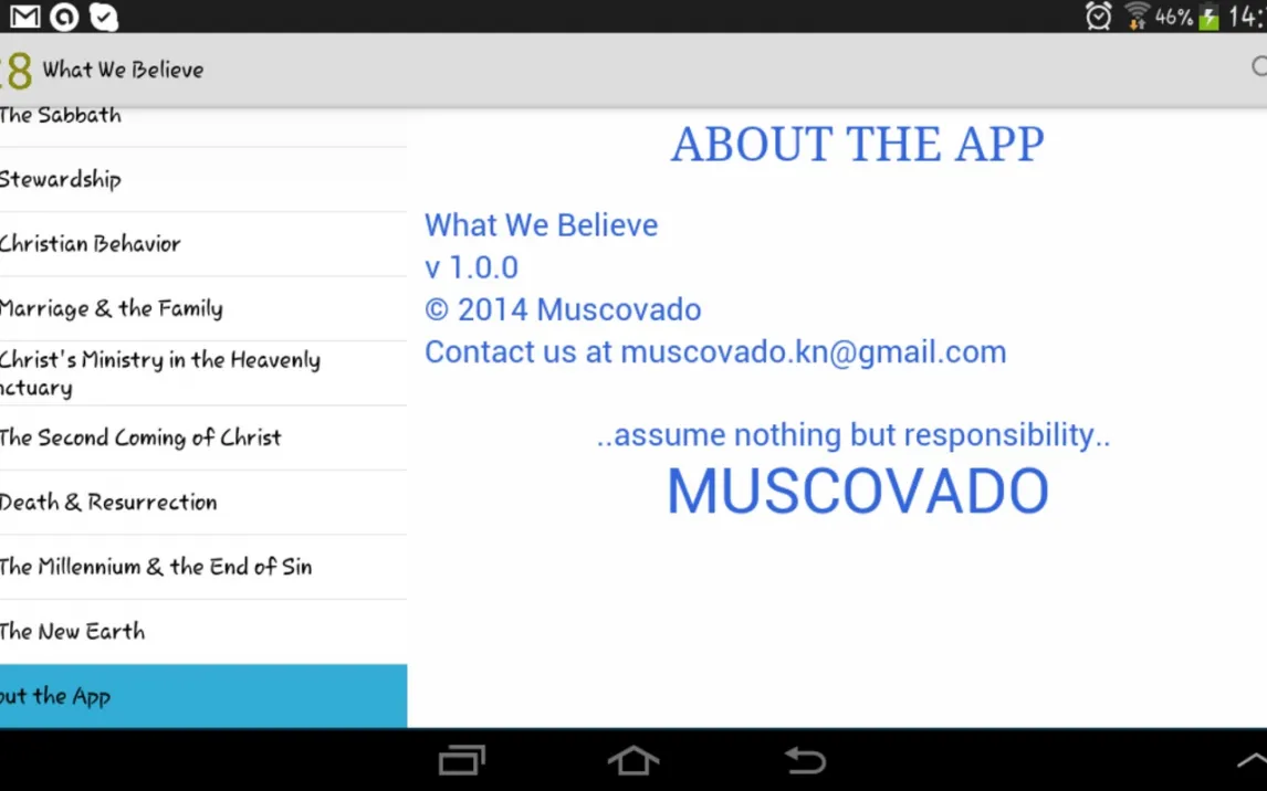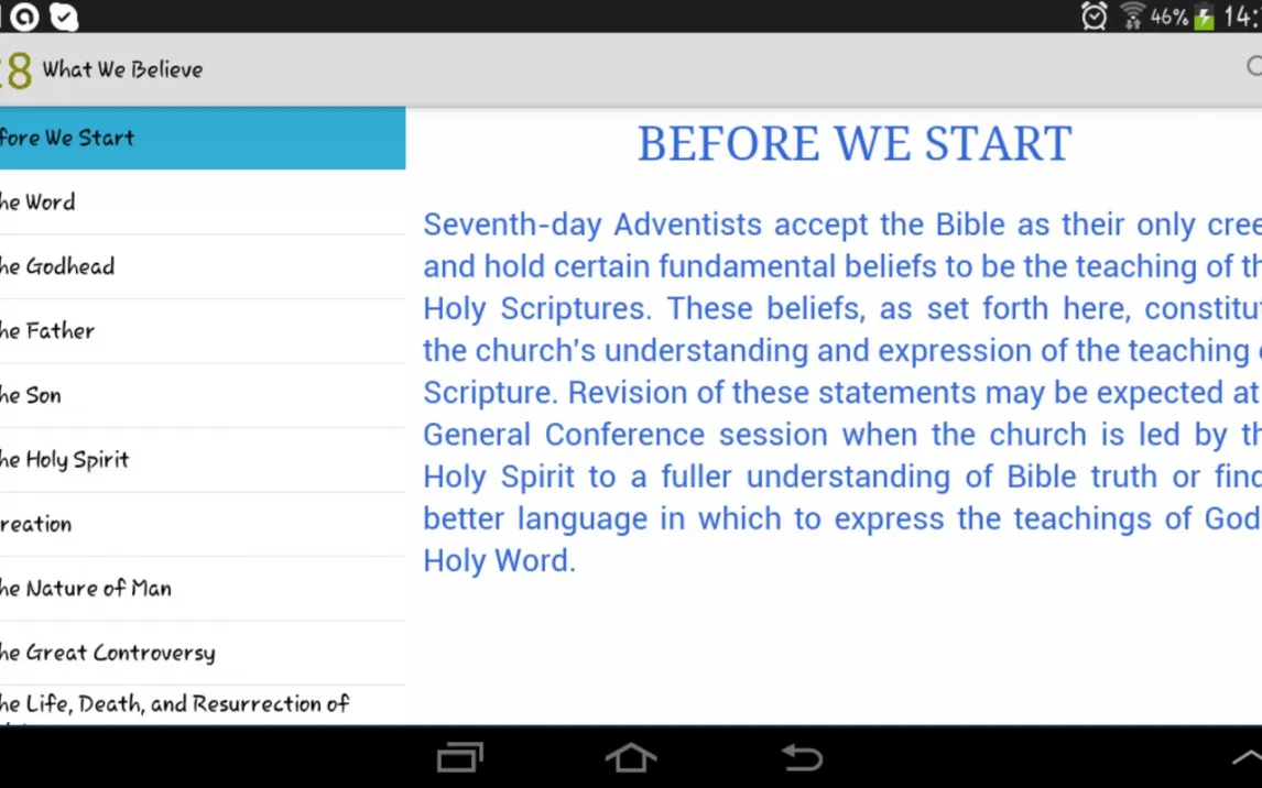 Основной интерфейс приложения организован вокруг списка ключевых вероучений, что обеспечивает линейное и логичное изучение. Механика работы построена на детальном раскрытии каждого пункта: после выбора темы пользователь получает не только текст убеждения, но и его теологическое обоснование. Техническая особенность — встроенная синхронизация всех библейских ссылок с текстом Священного Писания, что позволяет мгновенно переходить к контексту. Режим работы автономен после первичной загрузки данных, что делает изучение возможным без постоянного подключения к сети.