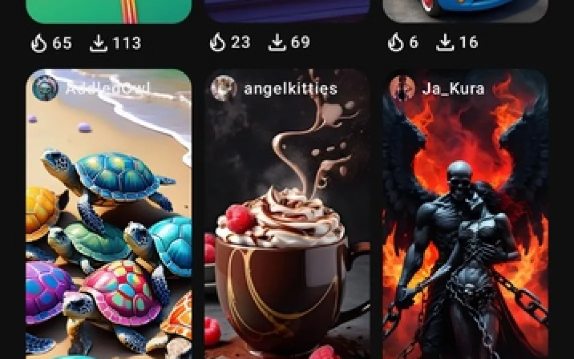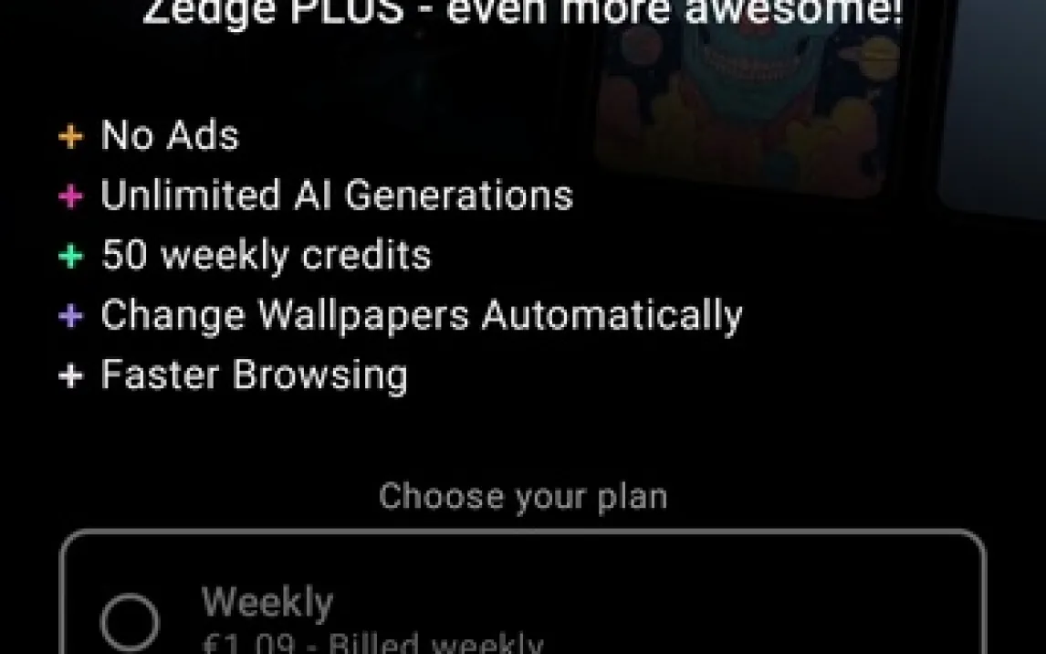 Инструмент на основе искусственного интеллекта генерирует уникальные обои высокого разрешения по текстовым запросам пользователя. Созданные изображения сохраняются в локальной галерее и могут быть опубликованы в общем каталоге приложения для других пользователей. Регистрация через аккаунт Google или Facebook предоставляет доступ к облачному хранилищу для резервного копирования персональных коллекций и истории загрузок. Монетизация реализована через показ рекламных баннеров и видеороликов, а также через подписку Zedge Plus, которая отключает всю рекламу, снимает лимиты на генерацию ИИ-обоев и предоставляет еженедельные кредиты для получения премиум-контента.