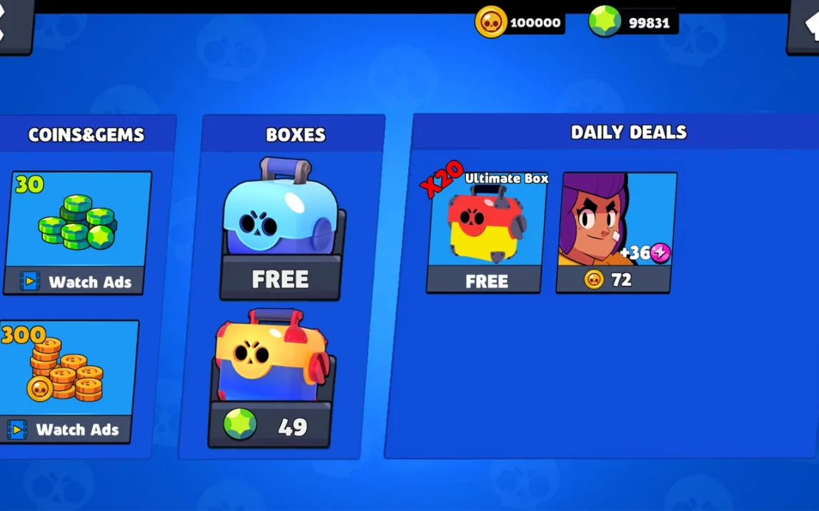 Brawl Stars Box построен на системе быстрых PvP-матчей в разнообразных игровых режимах. Вы собираете коллекцию уникальных бойцов, каждый с особыми атаками и суперспособностью, и сражаетесь на аренах с разными целями. Механика управления оптимизирована для мобильных устройств: виртуальный джойстик для движения и крупные кнопки для атак и активации способностей обеспечивают точный контроль в напряжённых ситуациях.