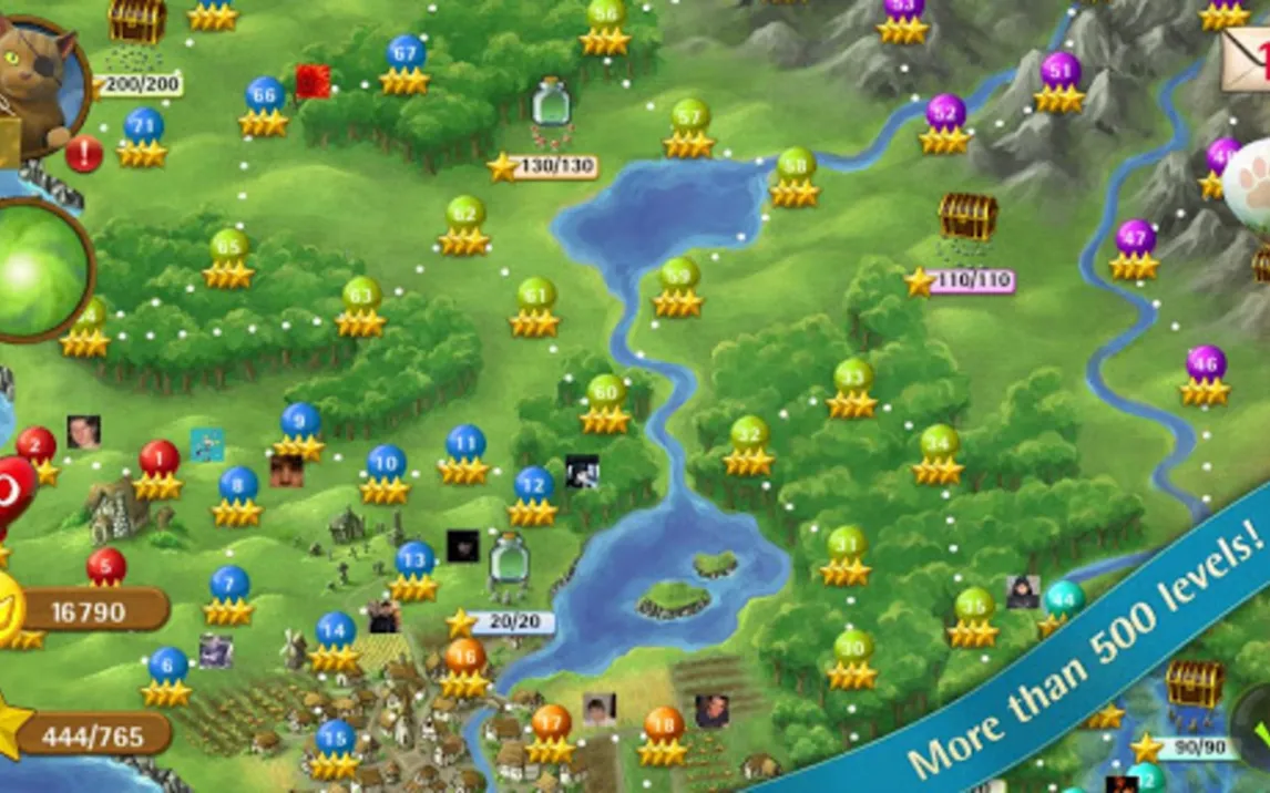 Игра включает более 500 последовательных уровней, сложность которых прогрессивно увеличивается за счет введения новых типов блоков, ограниченного количества выстрелов и сложных геометрических форм игрового поля. Доступна онлайн-таблица лидеров для синхронизации результатов с друзьями и сравнения прогресса. Прогрессия сопровождается системой разблокировки вспомогательных элементов и бонусных заклинаний, таких как шар-ракета и цветная бомба, которые активируются в критических игровых ситуациях.