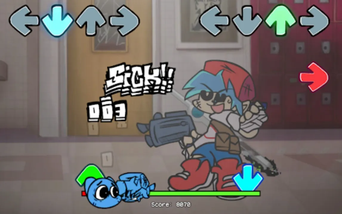 Игровой процесс строится на синхронном нажатии стрелок в такт музыке. На экране отображаются две дорожки: правая показывает вашу последовательность нот, левая — действия оппонента. Точность каждого нажатия влияет на шкалу здоровья, которую необходимо поддерживать для победы в каждом раунде. Сложность постепенно нарастает — увеличивается темп композиций и усложняются паттерны стрелок, что требует от игрока постоянной концентрации и быстрой адаптации. Графическое исполнение использует яркий, контрастный визуальный ряд с персонажами, стилизованными под анимационные произведения, что добавляет визуальной динамики каждому бою.