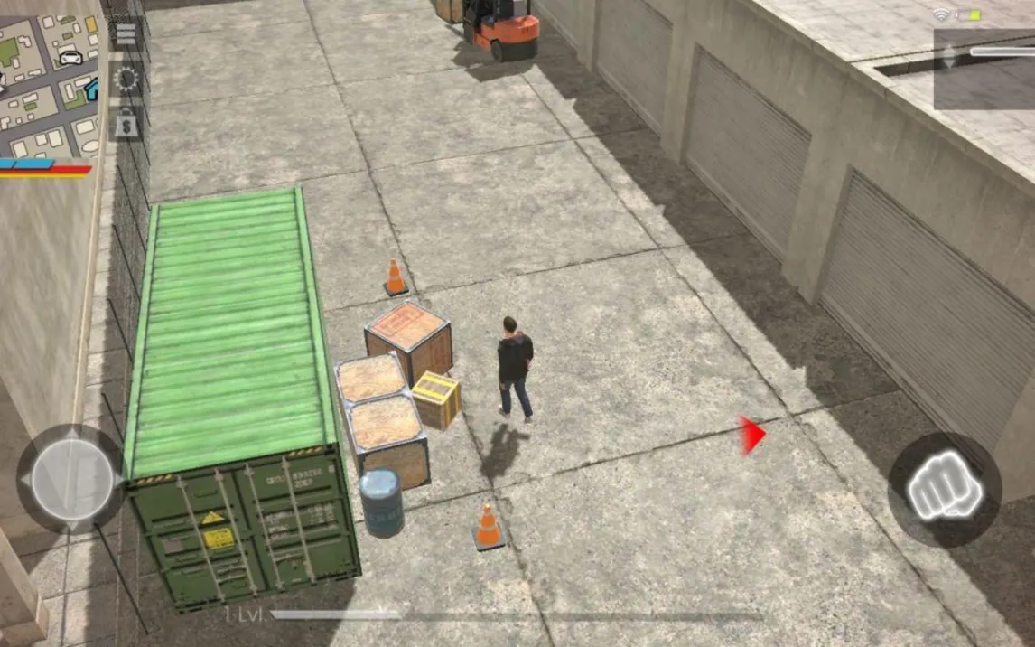 Управление реализовано через виртуальный джойстик в левой части экрана и панель действий справа, отвечающую за стрельбу, прыжки, взаимодействие с объектами и вождение. Карта города, доступная для просмотра в любой момент, отображает текущее положение игрока, точки интереса и активные миссии. Визуальный стиль — детализированная трехмерная графика с зенитной камерой, что обеспечивает хороший обзор во время погонь и перестрелок. Важной составляющей является система кастомизации внешности персонажа перед началом игры.