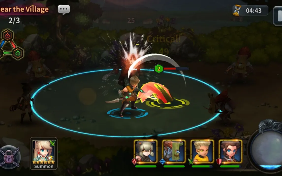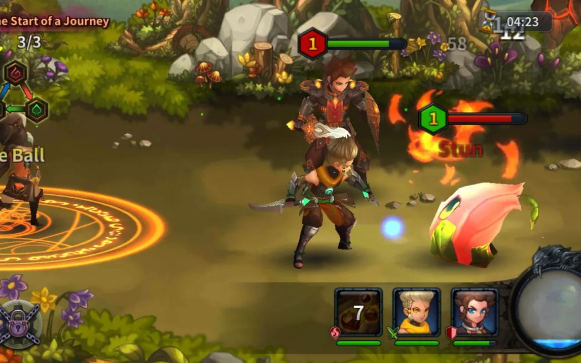 Боевая система интуитивна, но не лишена глубины. Персонажи сражаются автономно, атакуя ближайших врагов, что позволяет сосредоточиться на глобальной тактике. Однако полный контроль доступен через ручную активацию умений: касание портрета героя запускает его особую атаку или поддержку. Некоторые мощные способности, например, зональные эффекты, требуют дополнительного тактического выбора — их необходимо активировать в определенной точке поля боя, что добавляет слоистости в, казалось бы, простой процесс.