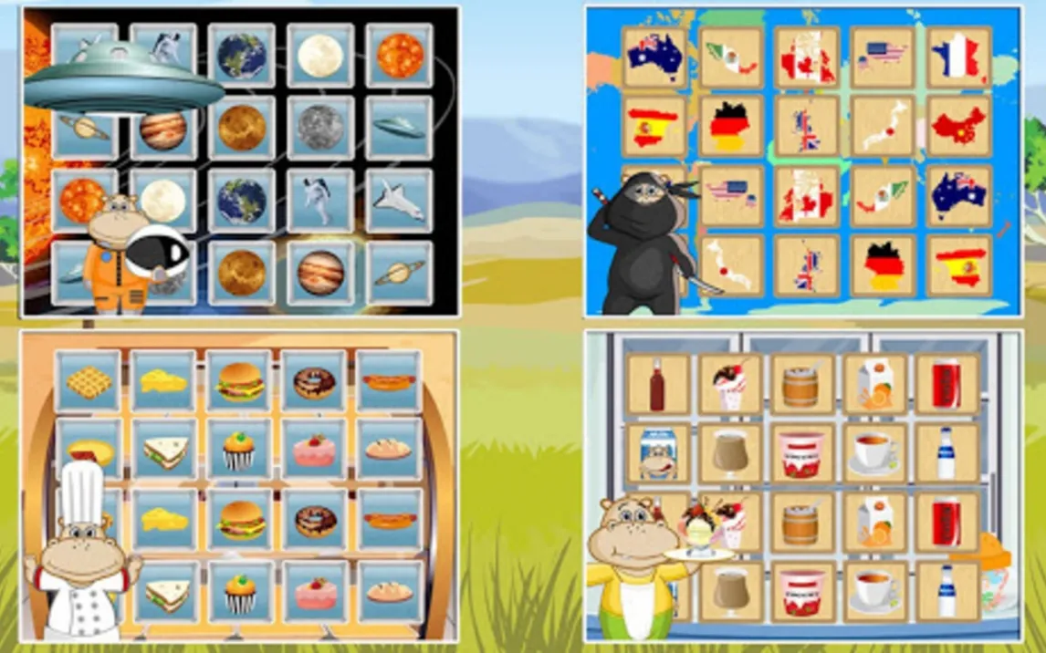 Приложение предлагает классическую механику поиска парных карточек, адаптированную для детского восприятия. Игровое поле состоит из наборов перевёрнутых карточек с яркими, понятными изображениями. Ребёнок последовательно открывает две карточки, пытаясь найти совпадения. При успешном совпадении пара карточек исчезает с поля, при неудаче — переворачивается обратно, что тренирует кратковременную память. Сложность постепенно возрастает за счёт увеличения количества карточек и усложнения изображений.
