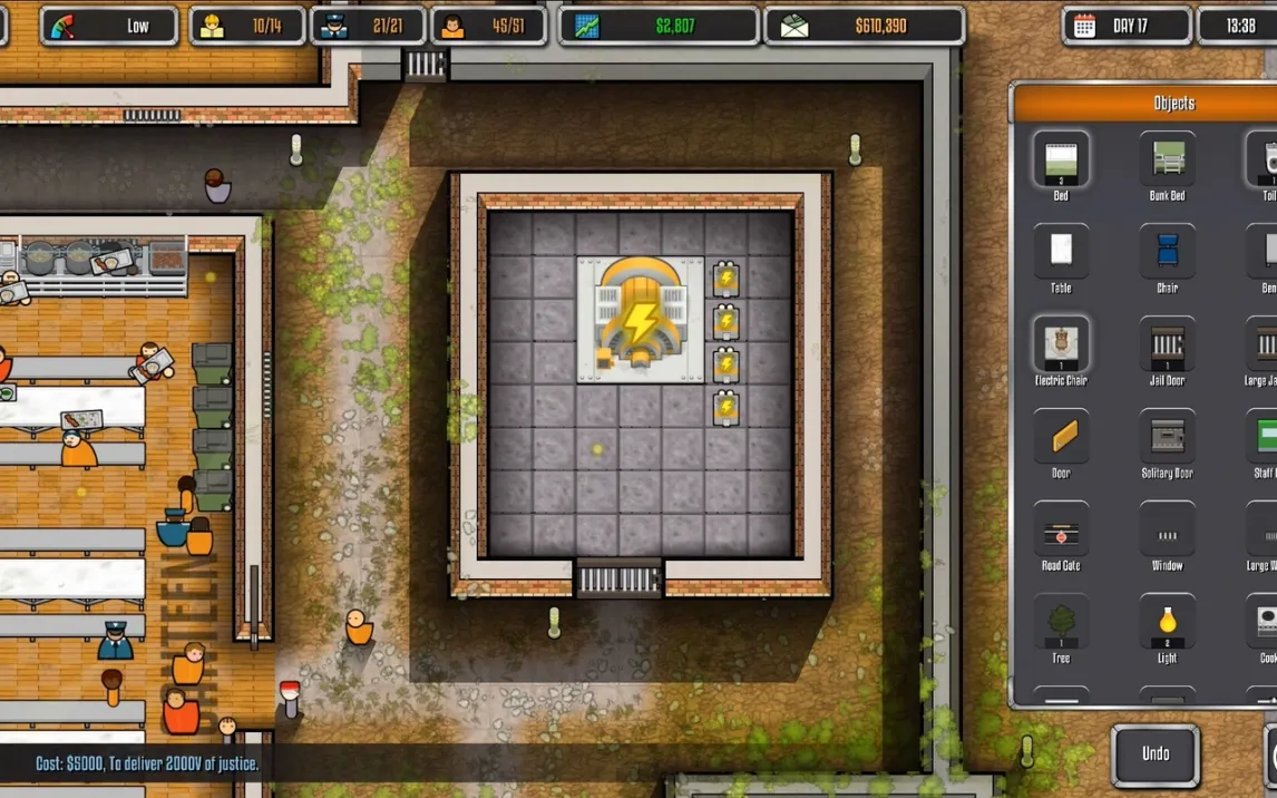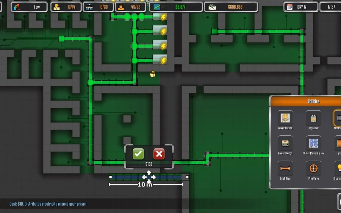 Игровой процесс строится на последовательном проектировании, строительстве и ежедневном управлении тюрьмой. Пользователь контролирует каждый этап: от разметки фундамента и возведения стен с расстановкой дверей до прокладки сложных инженерных коммуникаций, включая системы электроснабжения и водопровода. Критически важным является найм и распределение персонала — охранников, рабочих, поваров — и организация их логистики для поддержания порядка и выполнения распорядка дня. Экономическая модель требует баланса между расходами на содержание, безопасность и доходом, который зависит от количества заключённых и эффективности объекта.