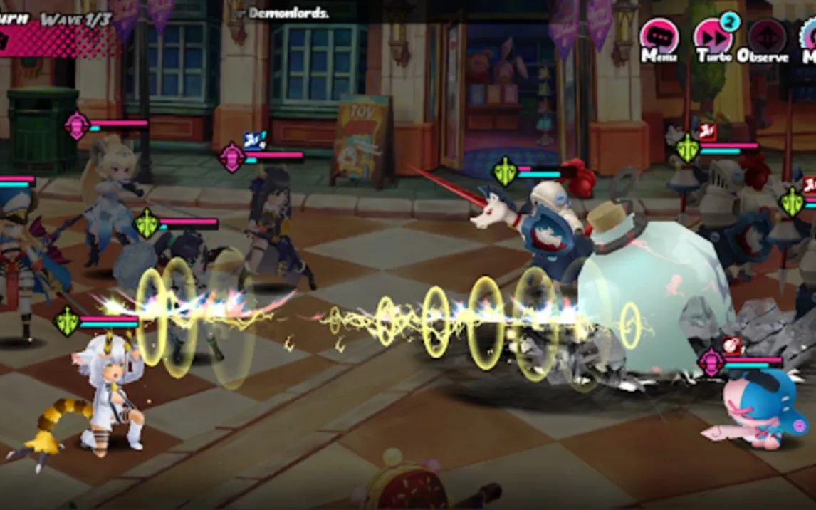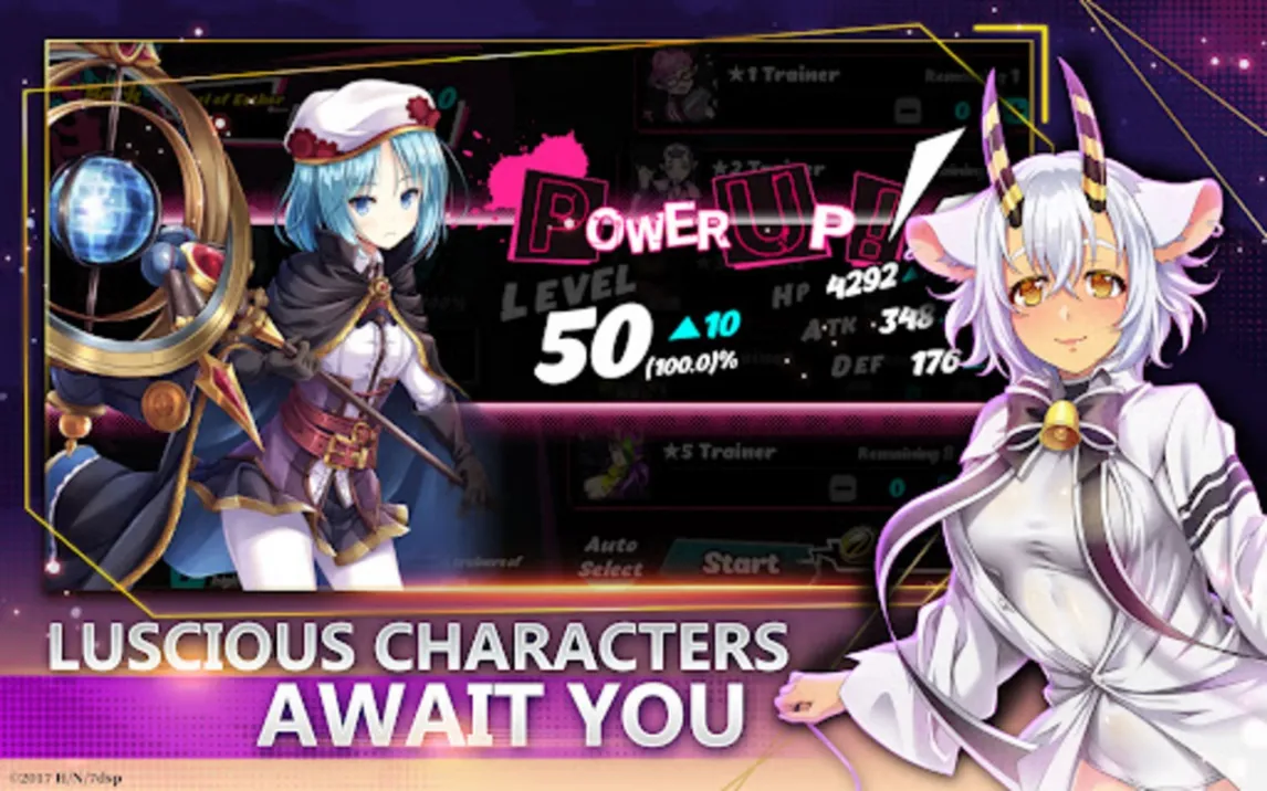 Игра использует детализированную 2D-анимацию в стиле аниме для ключевых сцен и атак персонажей. Интерфейс включает систему автоматического прохождения для повторяющихся задач, опцию увеличения скорости боя и возможность предварительного просмотра результатов применения навыков. Коллекционная система предлагает регулярные события для получения новых героев, а система снаряжения позволяет модифицировать характеристики каждого члена отряда.