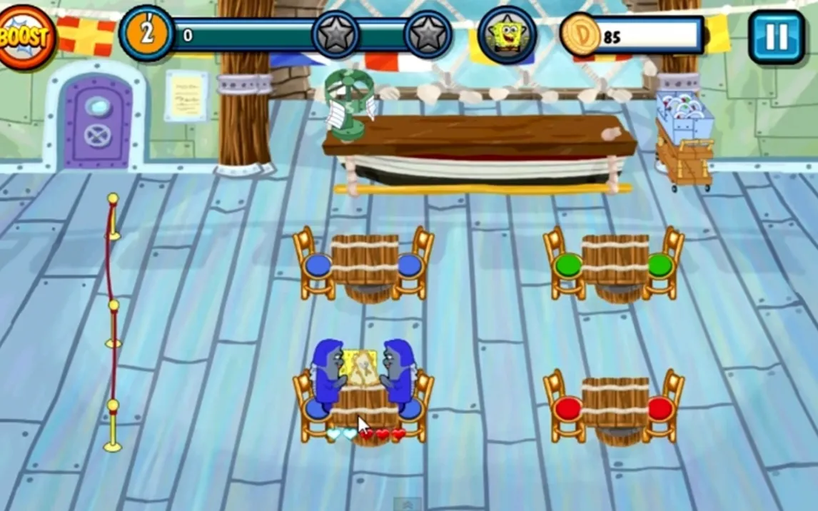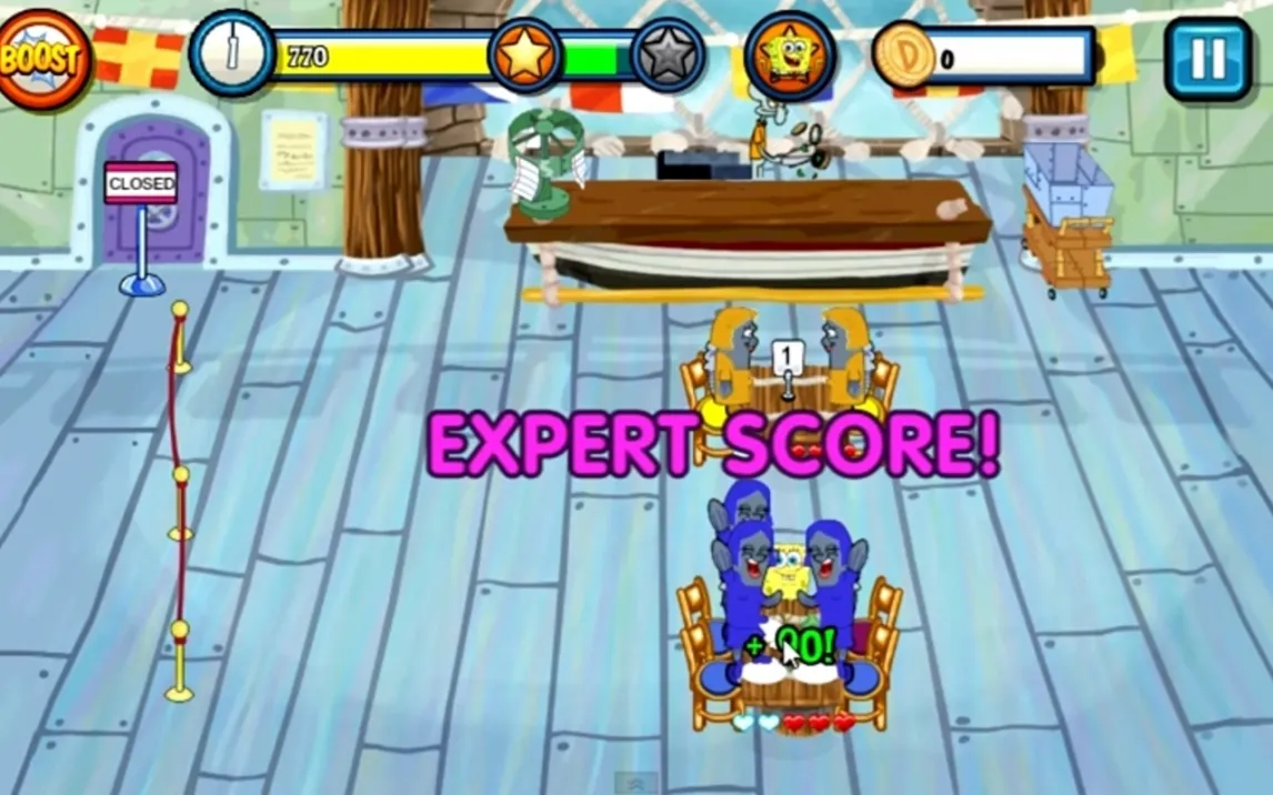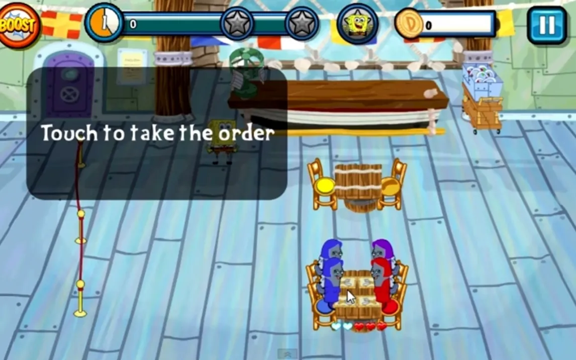 Игровой процесс строится на чёткой последовательности действий: встреча гостя, принятие заказа, передача его на кухню, подача блюд и, наконец, расчёт. Ключ к успеху — в оптимизации маршрутов и предвосхищении желаний клиентов. Особый шарм игре придают визиты знаменитых жителей Бикини Боттом. Патрик Стар может надолго задуматься у меню, Сэнди Чикс потребует обслуживания с техасской скоростью, а брюзга Сквидвард станет проверкой вашего терпения. Каждый такой визит — это уникальный игровой вызов и отсылка к оригинальному сериалу. Визуальное исполнение выполнено с большой любовью к исходному материалу: фон и персонажи выглядят как нарисованные от руки, а анимации полны характерных деталей и юмора.