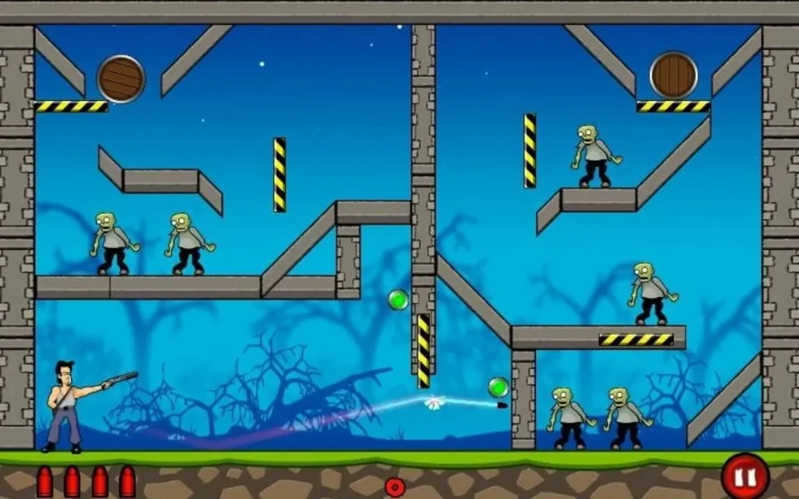 Stupid Zombies — это динамичная аркада, где ваша цель — очистить уровень от всех оживших мертвецов одним метким выстрелом или запустить цепную реакцию. Механика игры требует стратегического мышления: вы рассчитываете траекторию пули, которая может отскочить от стен несколько раз, прежде чем поразит цель. На многих уровнях вас ждут взрывающиеся бочки, хрупкие конструкции и другие интерактивные объекты, позволяющие одним удачным попаданием устранить целую группу противников.