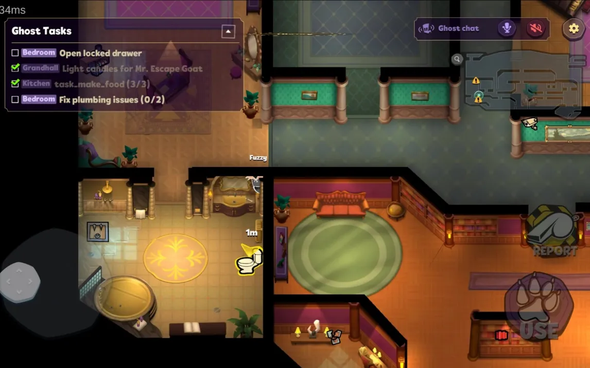 Управление оптимизировано для мобильных устройств: движение осуществляется виртуальным джойстиком в левой части экрана, а в правой расположены кнопки для взаимодействия с объектами и использования специальных способностей. Если игрок получает роль убийцы, в его интерфейсе активируется отдельная панель для совершения диверсий и устранения других участников. Задачи для невиновных игроков реализованы как набор мини-игр, требующих выполнения последовательных действий — от поиска конкретных предметов в комнатах до решения простых головоломок, например, восстановления порядка в библиотеке или починки сантехнических систем.